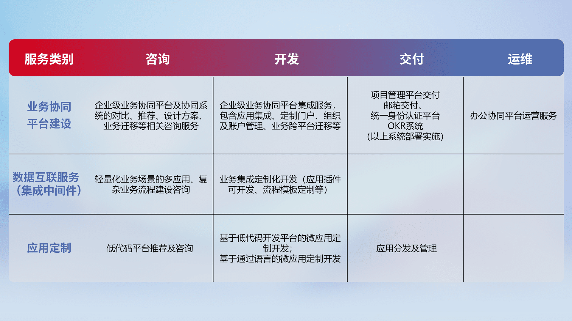 针对特定行业场景的全代码开发服务,,,,精确足满足客户业务服务及系统定制化需求。。。。重点服务汽车、、、、农业、、、、制造业等高端高质量客户。。。。提供如专业管理系统、、定制化门户、、、、业务工作台等开发落地。。。